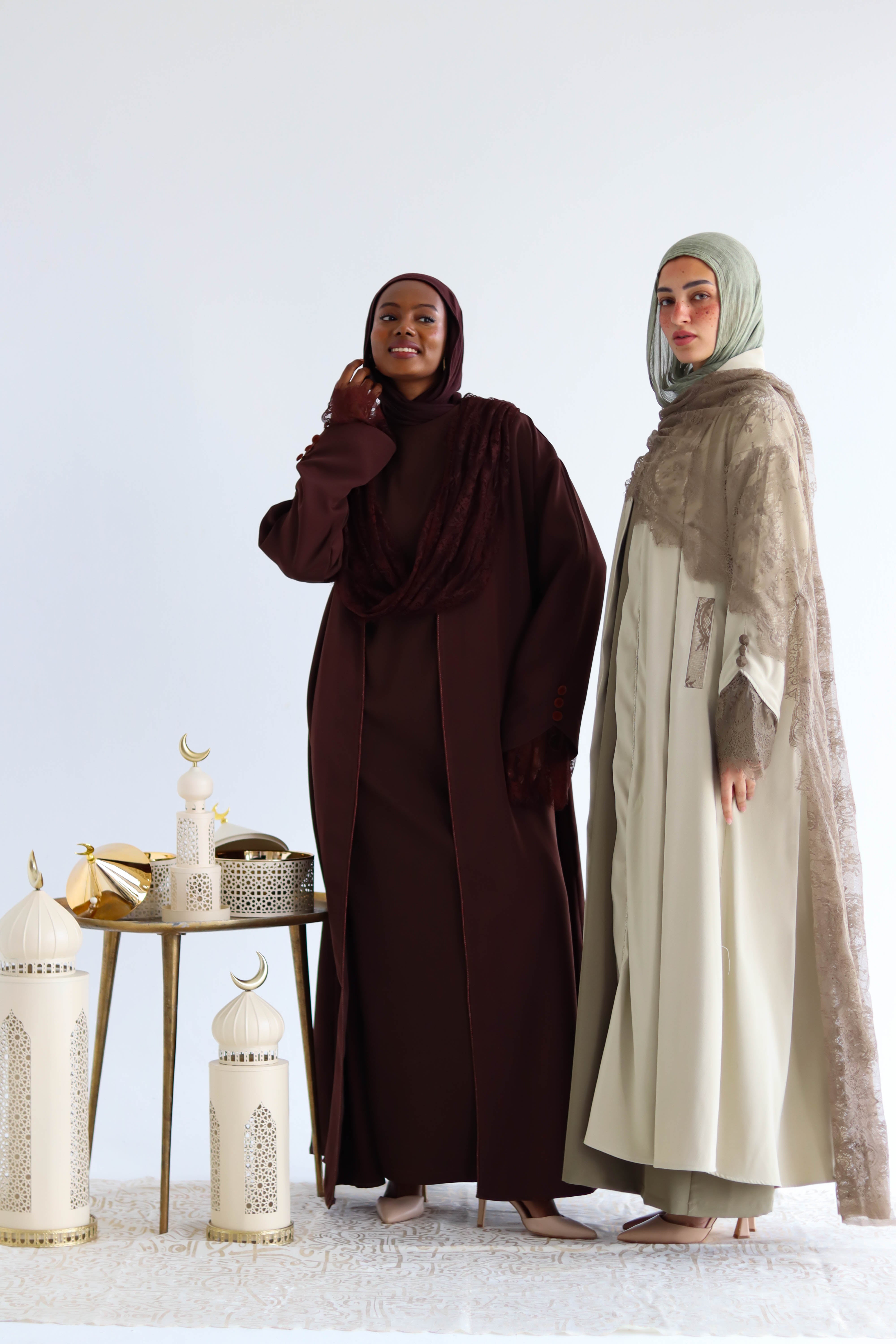 This abaya is crafted from premium crepe fabric, known for its soft flow and graceful drape. Accented with exquisite French lace.